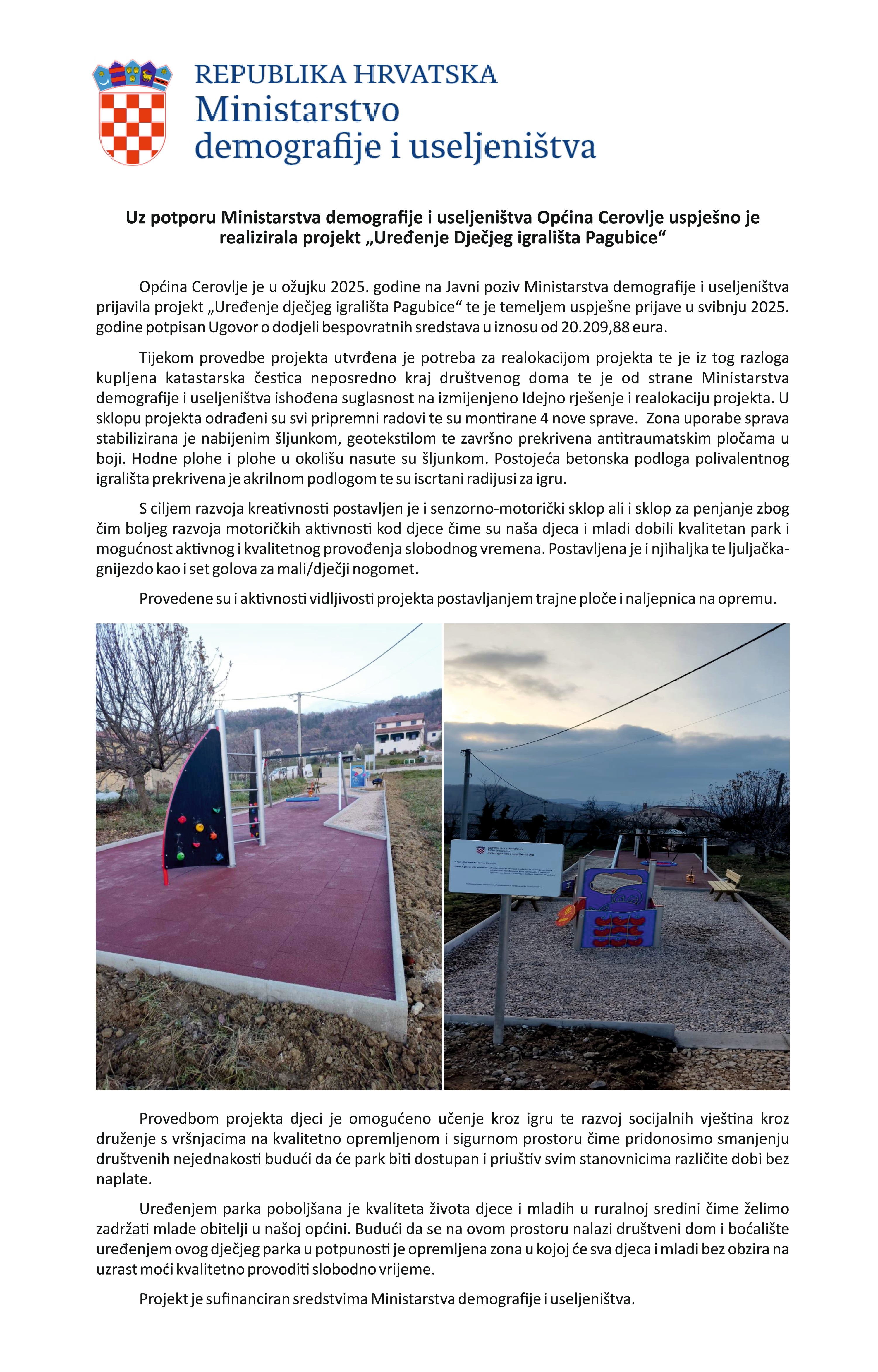 Uz potporu Ministarstva demografije i useljeništva Općina Cerovlje uspješno je realizirala projekt „Uređenje Dječjeg igrališta Pagubice“